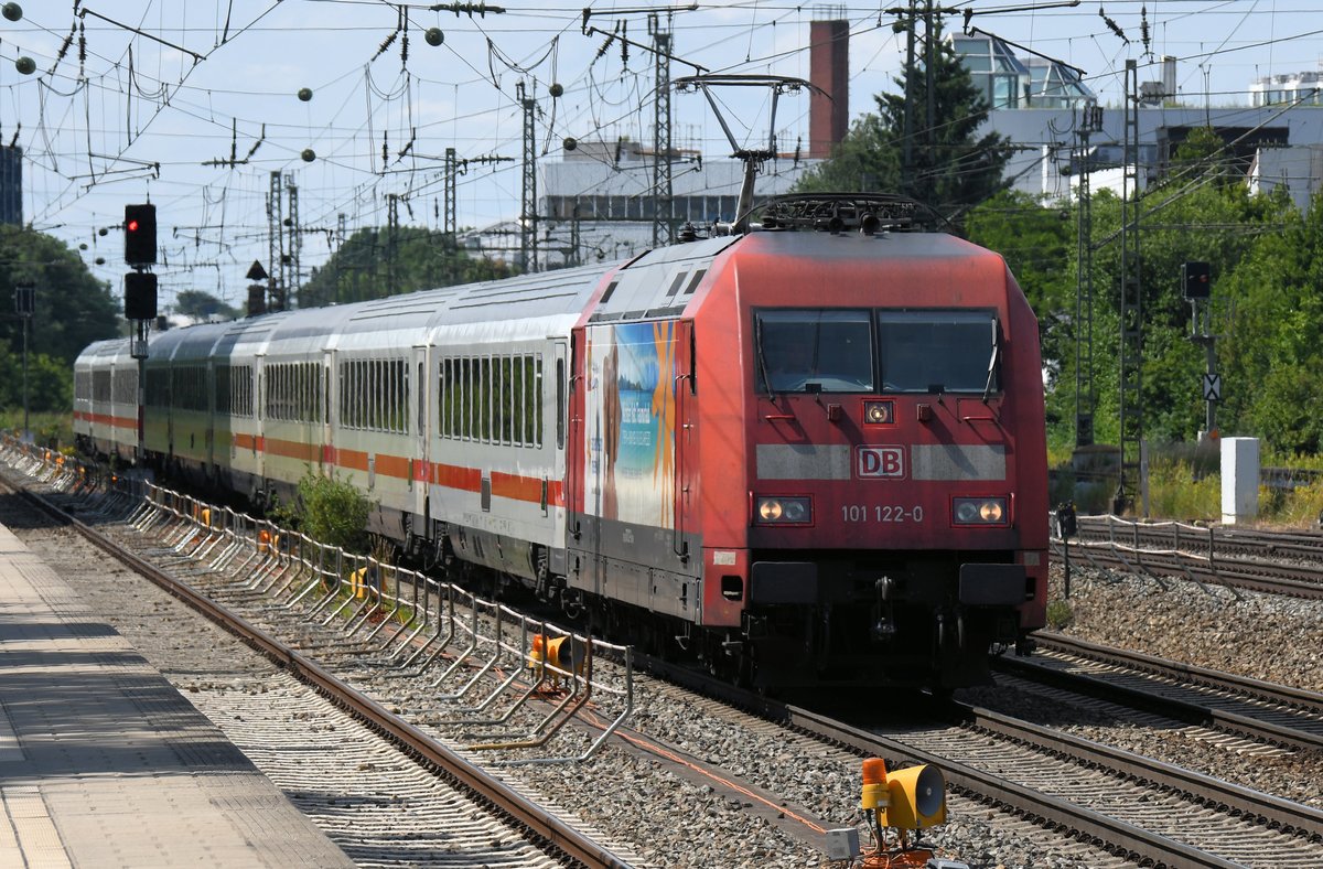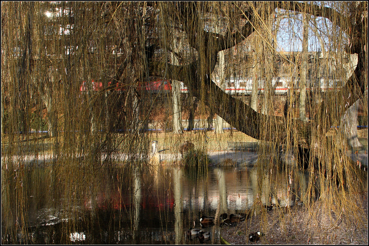 Bei seiner Ausfahrt aus dem Stuttgarter Hauptbahnhof in Richtung München, fährt der ICE Valero D in Stuttgart zunächst am Unteren Schlossgarten entlang. Das Hellgrau diese Zuges sticht nicht so hervor, wie das Verkehrsrot der Nahverkehrszüge.