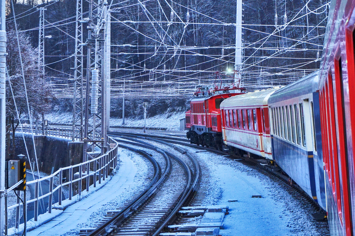 1020 018-6 fährt mit SR 17406 (Lienz - Spittal-Millstättersee - Salzburg Hbf), aus dem frostigen Bahnhof Schwarzach-St. Veit aus.