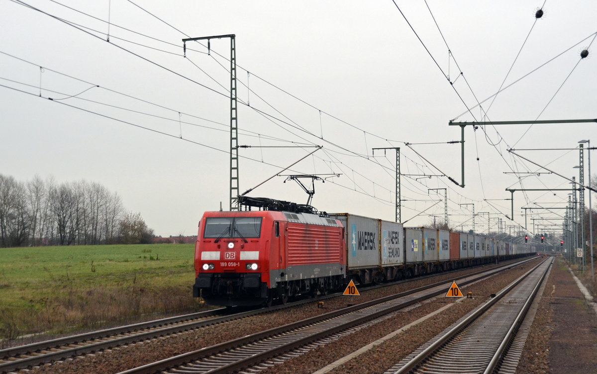189 058 schleppte am 09.12.16 einen langen Containerzug durch Rodleben Richtung Magdeburg.