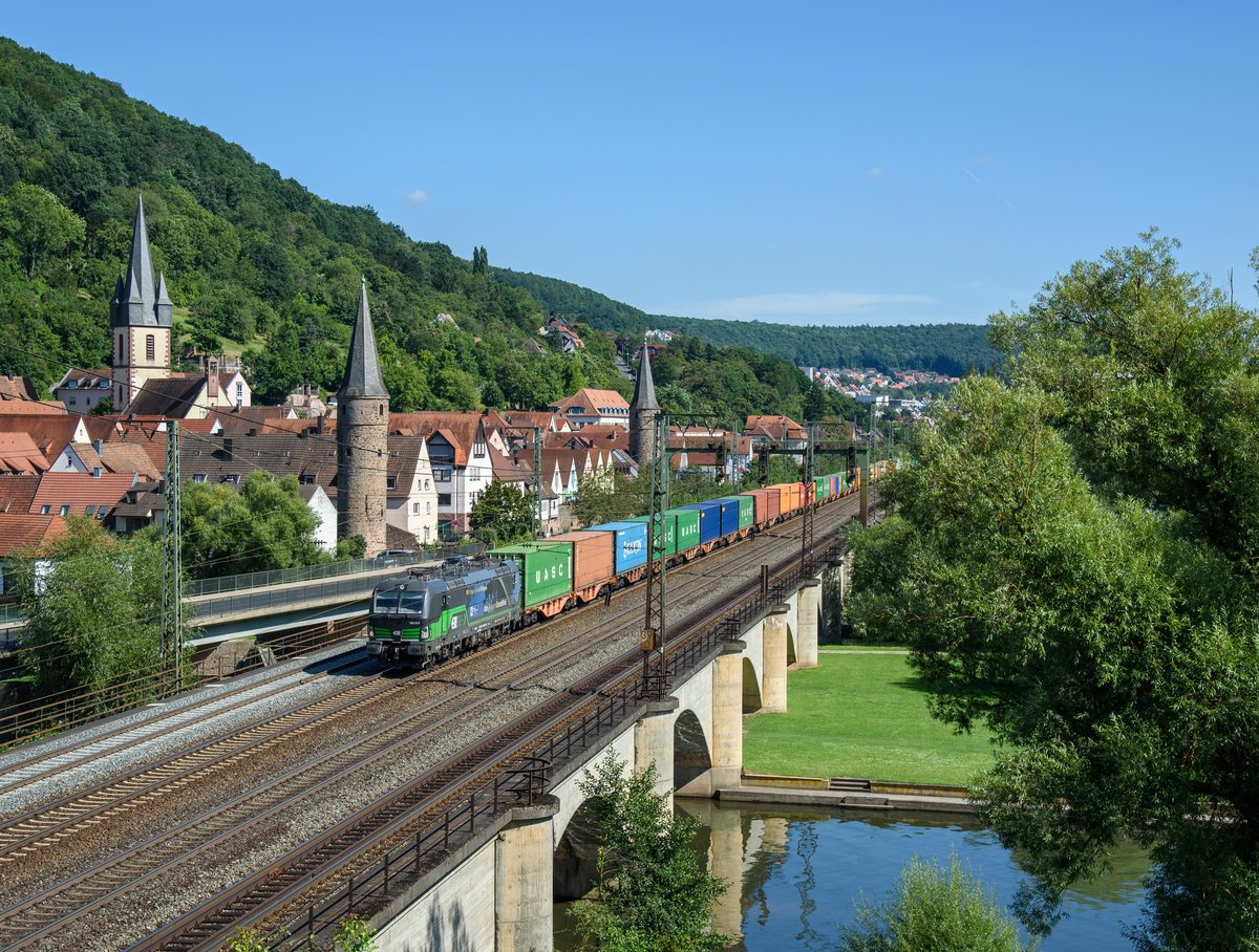 193 213 ELL-WLC mit Containern Richtung Norden in Gemünden am Main.(13.8.2016).