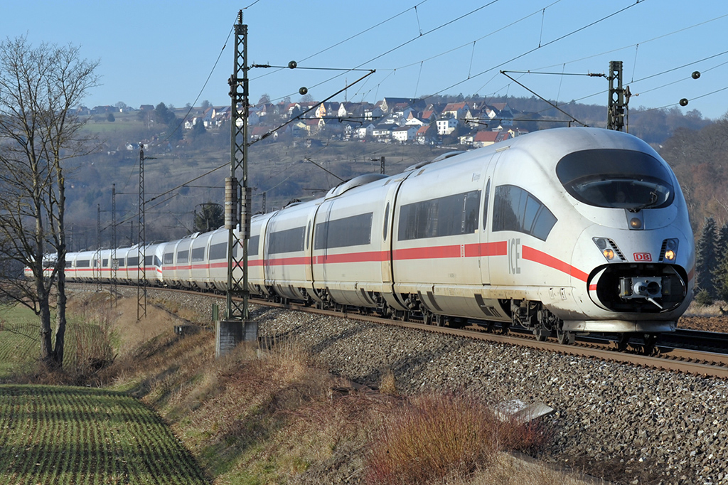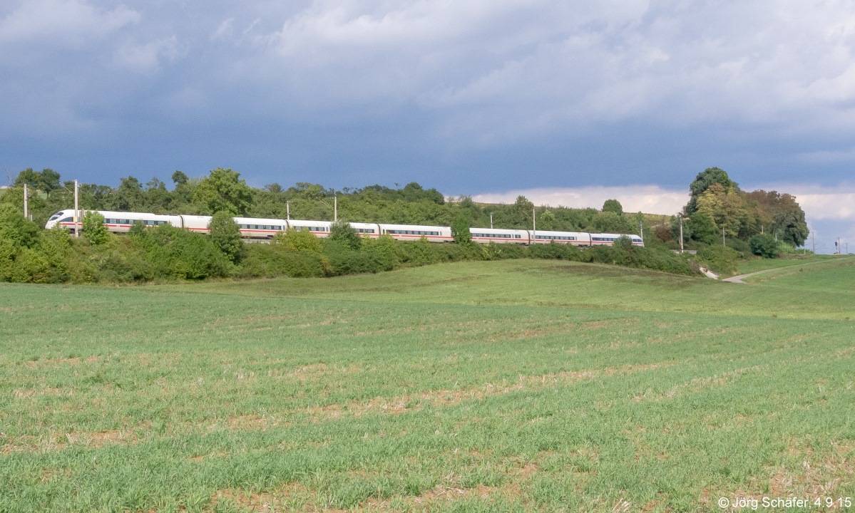 "Bergauf nach Süden!" Der ICE nach München passierte am 4.9.15 gerade den Strecken-km 109 bei der kleinen Barthsmühle. (Blick Richtung Nordwesten)