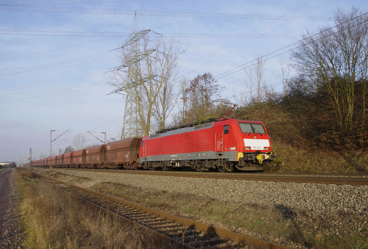 Am 28.12.2016 war die Moselstrecke wegen Tunnelarbeiten gesperrt. Dadurch musste der "Erzbomber" aus Maasvlakte den Umweg durch den Pfälzer Wald nehmen. Durch die Steigungen zwischen Neustadt/Weinstraße und Kaiserslautern war eine dritte 189er als Schublok erforderlich, diese Arbeit leistete 189 044. Zuglok war 189 047, als Vorspann lief 189 042. Bahnstrecke 3230 Saarbrücken - Karthaus beim Kraftwerk Ensdorf.