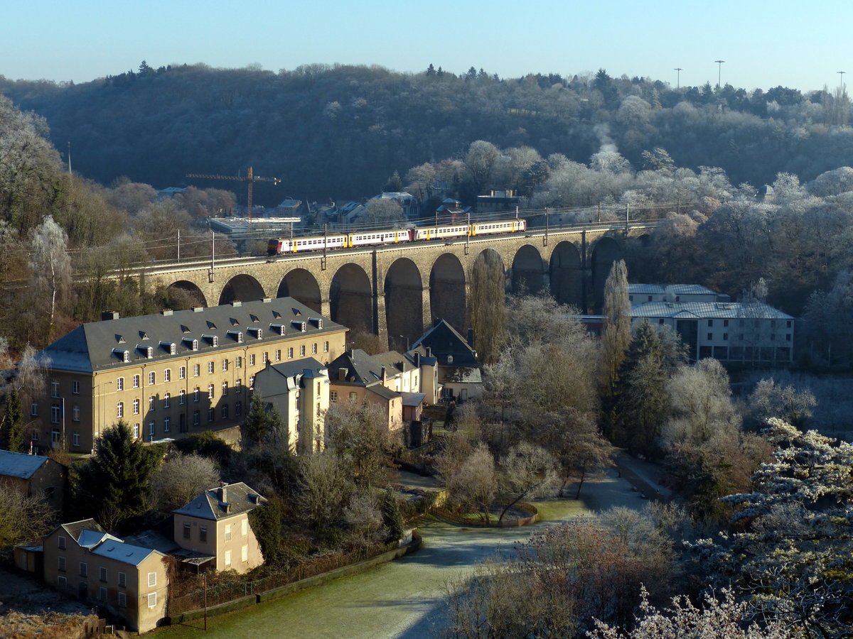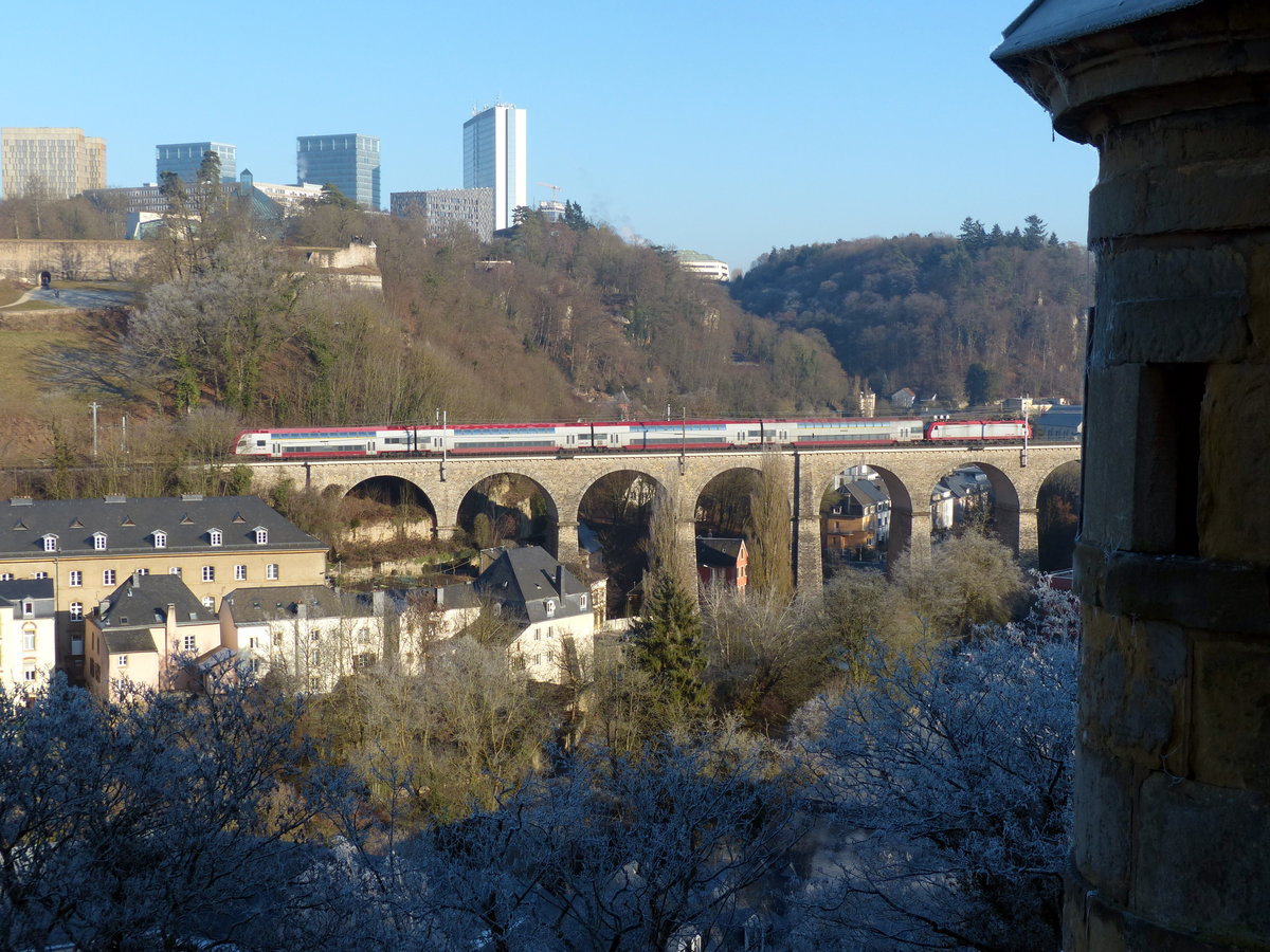 In schönster Wintersonne zeigt sich ein Regionalzug auf dem Pfaffenthaler Viadukt in Luxemburg Stadt. Das spanische Türmchen aus dem 17. Jahrhundert hat schon viele Wetterstimmungen und Züge kommen und gehen sehen. Im Hintergrund das Kirchberg-Plateau, das verschiedene EU-Institutionen beherbergt - z.B. den Europäischen Gerichtshof, Europäischen Rechnungshof und einige mehr. 30.12.2016, Luxemburg Oberstadt
