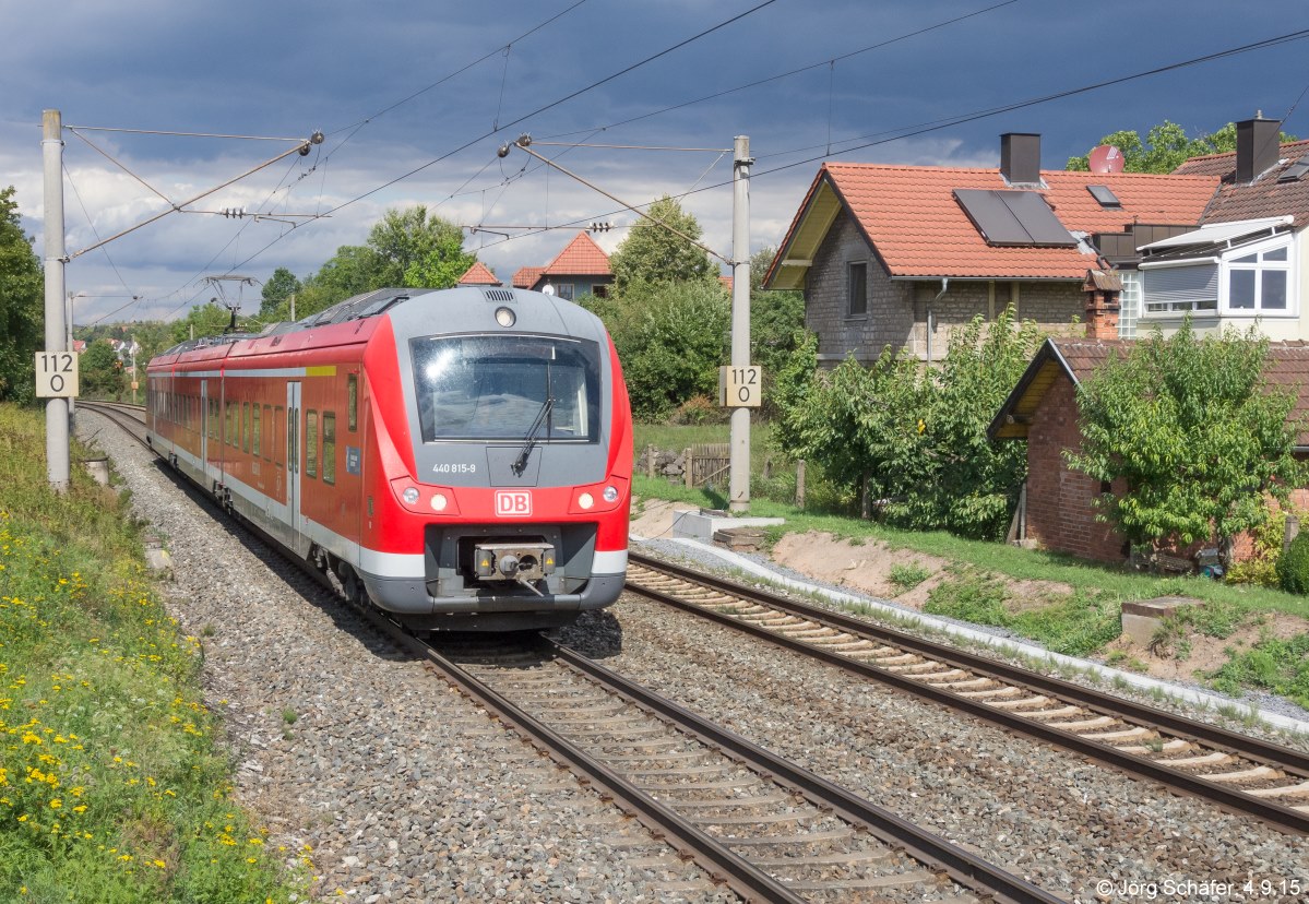 Am 4.9.15 durcheilte 440 815 als RB nach Treuchtlingen den ehemaligen Haltepunkt Obernbreit. Die früheren Bahnsteige waren inzwischen verschwunden und das alte Empfangsgebäude rechts erhielt einen neuen Anbau.
