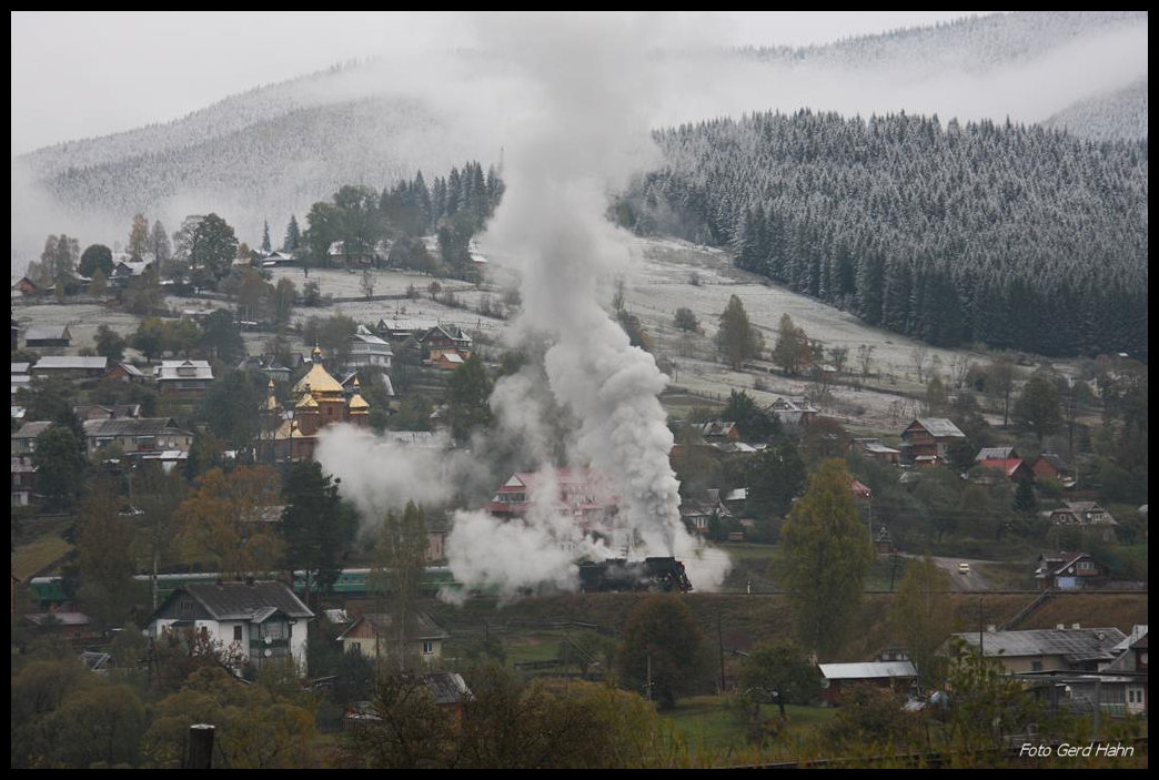 L 3535 bereitet sich hier am Fuß der am 14.10.2016 bereits schneebedeckten Karpaten auf die Überfahrt der Brücke bei Vorokta vor. Für die begleitende Fotografengruppe wird deshalb zunächst kräftig Dampf gemacht!