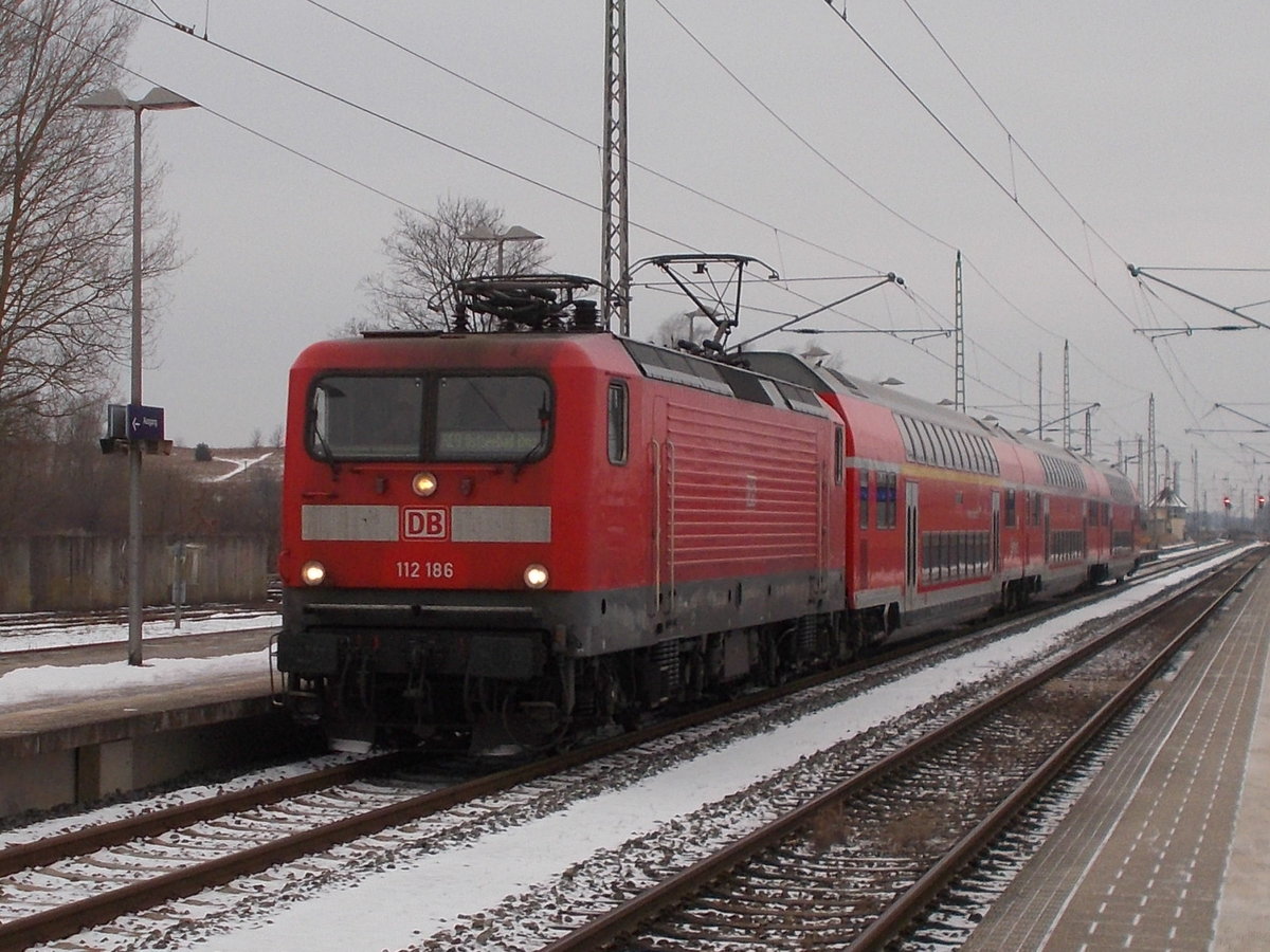 112 186,mit Doppelstockwagen vom Hanse Express,als RE 13023 Stralsund-Binz,am 11.Januar 2017,in Bergen/Rügen.