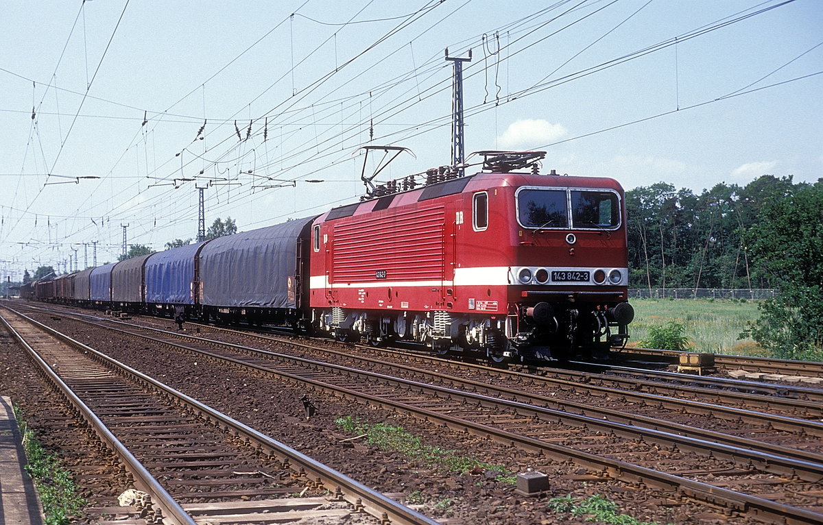 152 137 fuhr am 15.7.05 mit einem Güterzug in Ochsenfurt durch Gleis 3 am schmalen Inselbahnsteig vorbei.