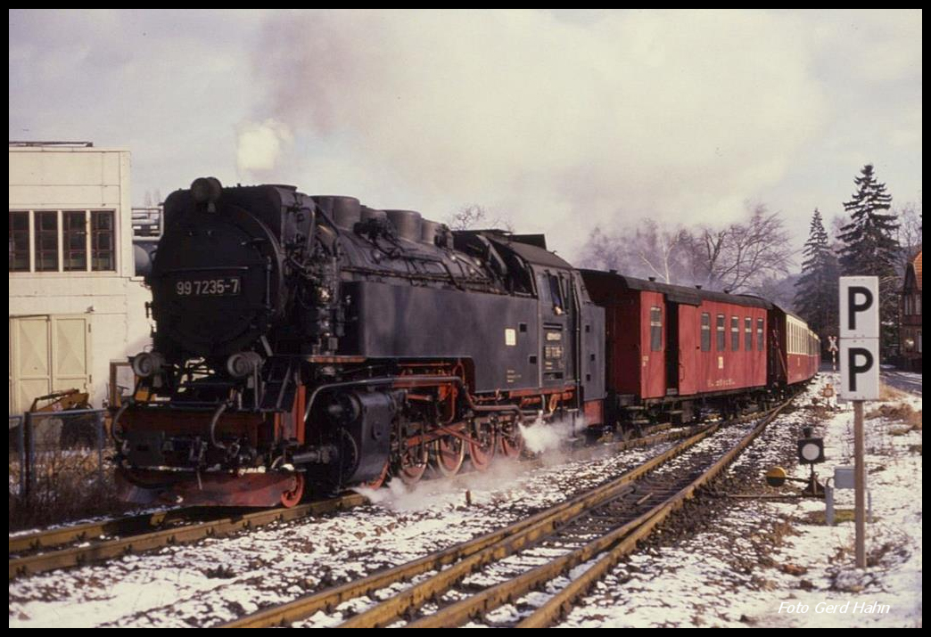 997235 fährt hier am 14.2.1990 um 11.16 Uhr mit einem Personenzug in den Oberharz in den Stadtteil Wernigerode Hasserode ein.