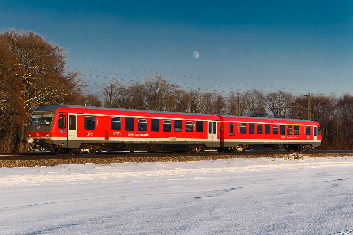 Der Filzenexpress von Wasserburg / Inn nach München Ost am Abend des 10-01-17 mit fast Vollmond in der Märchenlandschaft.
