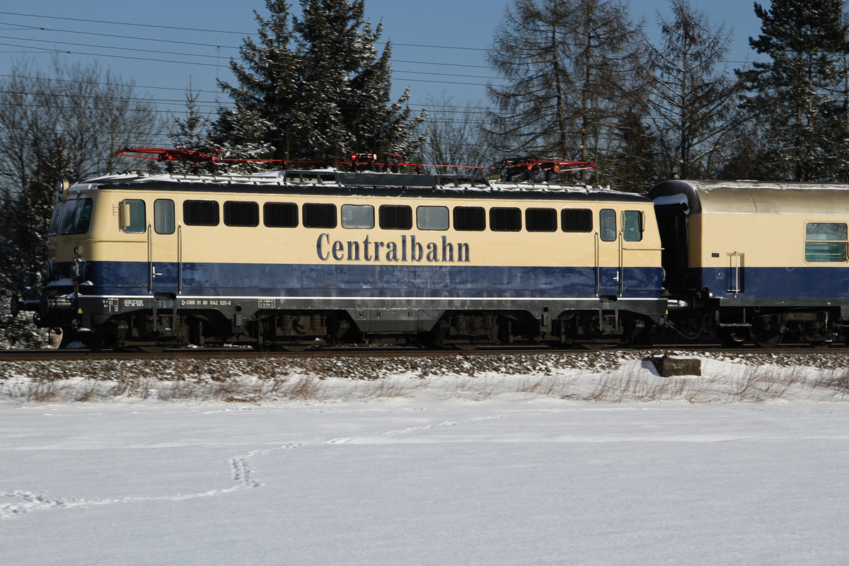 Die ehemalige ÖBB Elektrolok 1042.520 hängt hinten am Centralbahn Sonderzug. Zuglok ist 110 469-4 von D-Train in schöner Winterlandschaft am 10.01.17 bei Zorneding. Mit solchen Bahnbildern ist es ein guter Start ins neue Jahr.