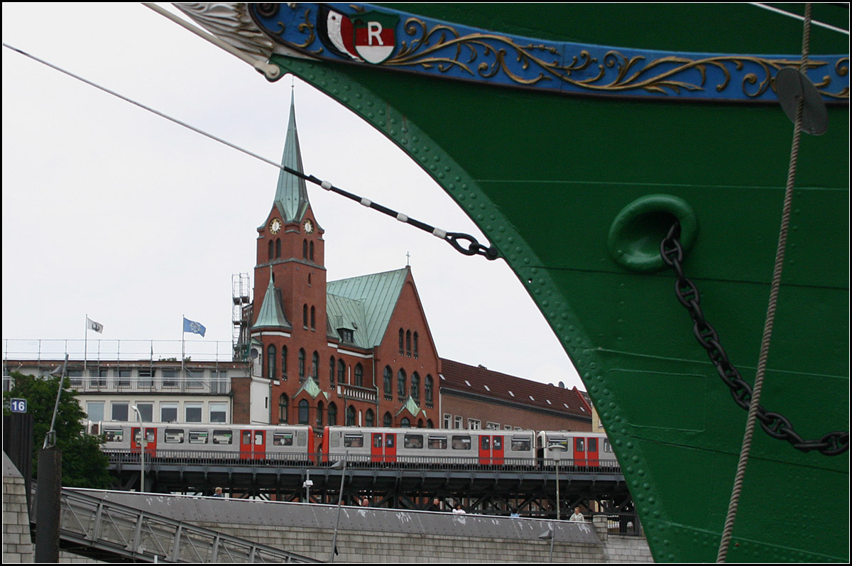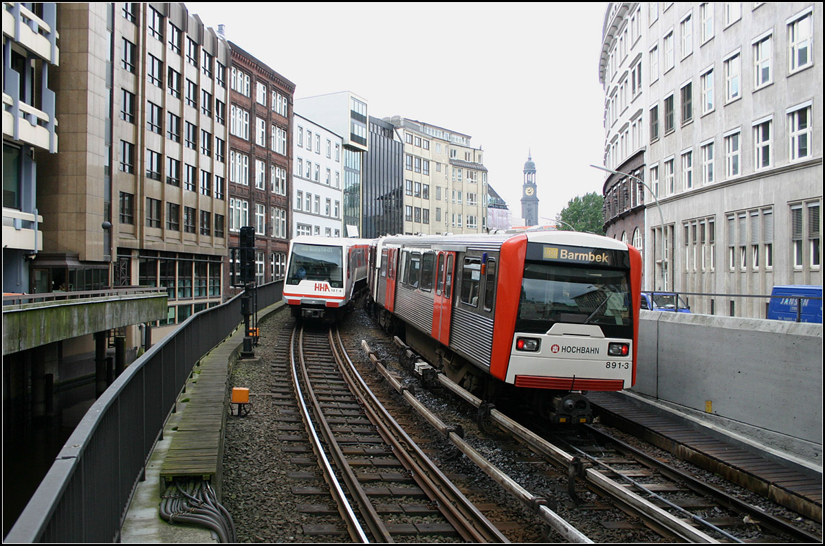 Die Hamburger U-Bahnlinie U3 verlässt nach der Station Rathaus den Tunnel und steigt auf einer kurvenreichen Rampenstrecke hinauf zur Hochbahnstation Rödingsmarkt. Dieser Fotostandpunkt ist inzwischen durch eine Schule überbaut.