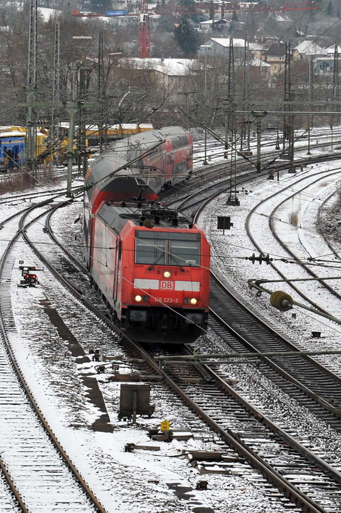03.01.2017, 146 223-3 bei der Ausfahrt aus dem göppinger Bahnhofsbereich
