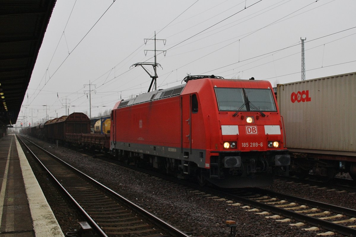 185 289-6 fährt am 17.12.2016 mit einem gemischten Güterzug aus Richtung Westen kommend in den Bahnhof Berlin Schönefeld Flughafen ein.