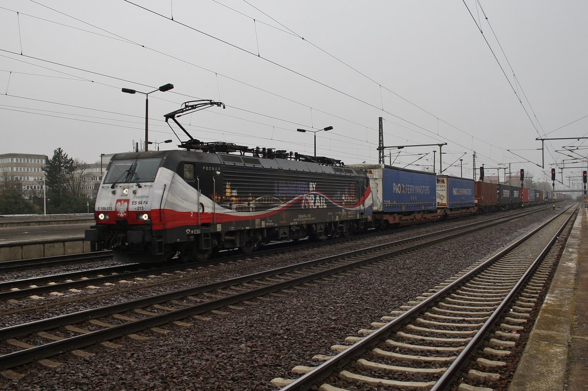 189 841-0 passiert mit einem Containerzug den Bahnhof Berlin Schönefeld Flughafen in östlicher Richtung. (17.12.2016)