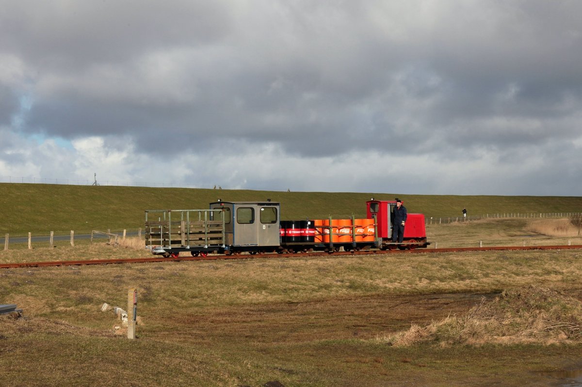 Am 24.02.2016 schiebt die private Schöma 2570 ihren Zug am Lüttmoorsiel zum Deich. An erster Stelle eine Schafskiste, die für weitere Einsätze fit gemacht wurde, dann folgt Lore 1 und danach 2 Flachwagen mit Fässern gefüllt mit Heizöl.