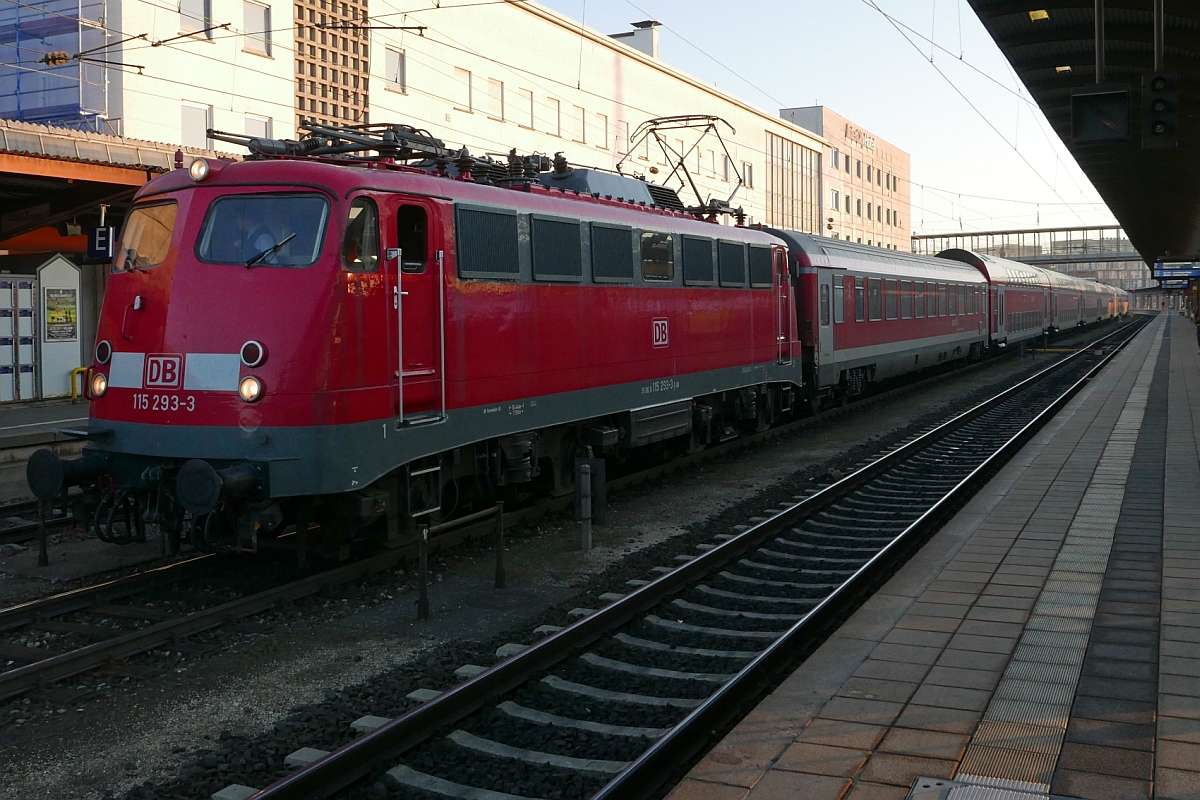 Auf dem zwischen den Gleisen 1 und 2 liegenden Durchfahrtsgleis im Ulmer Hauptbahnhof steht 115 293-3 mit einem Wagen (Bpmz 295.4) des München-Nürnberg-Express und sieben Doppelstockwagen der Südbahn am 06.12.2016 zur Abfahrt bereit. Nach dem Abtransport der Südbahn-Dostos wundert es einen nicht, dass seit dem Fahrplanwechsel in den Zügen der Südbahn einzelne Dostos aus Niedersachsen, Sachsen-Anhalt, Brandenburg und der Schwarzwaldbahn eingereiht sind.