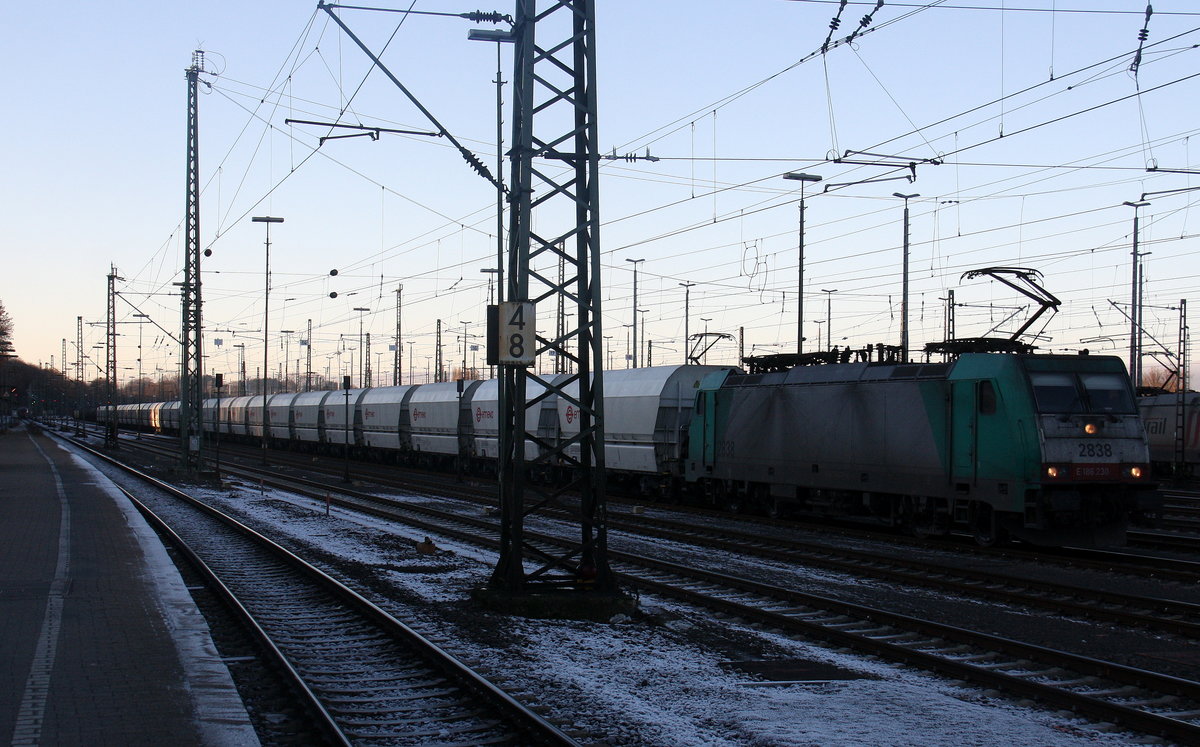 Die Cobra 2838 steht mit in Aachen-West einem Kalkleerzug aus Millingen(D) nach Yves-Gomezee(B) und wartet auf die Weiterfahrt nach Belgien. Aufgenommen vom Bahnsteig in Aachen-West.