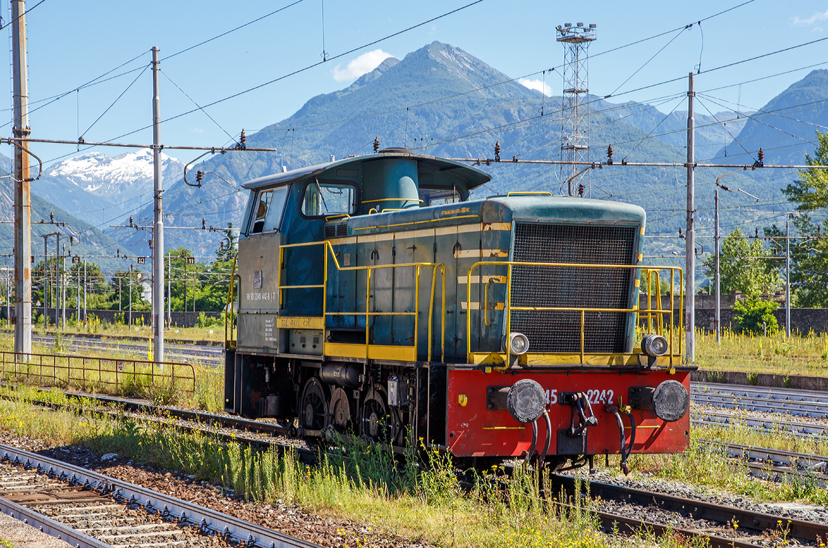 Die Dieselrangierlok D.245.442-8 (98 83 2245 442-8 I-TI) der Trenitalia (100-prozentige Tochtergesellschaft der FS), ex FS 245.2242, abgestellt am 27.12.2015 im Bahnhofsareal in Domodossola.