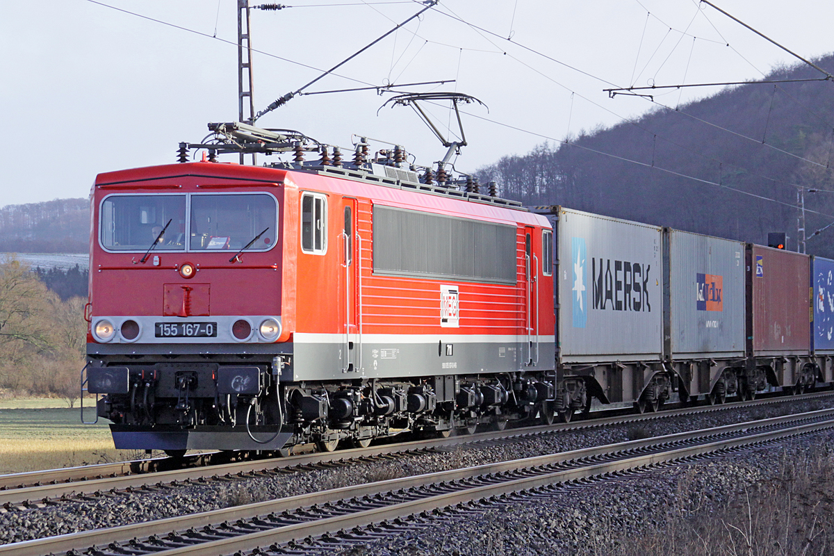 MEG 155 167-0 mit Containerganzzug am 14.01.2017 10:39 nördlich von Salzderhelden am Bü 75,1 in Richtung Göttingen