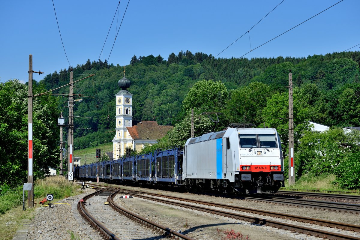 Mit dem Güterverkehr in Richtung Wels sah es am Nachmittag des 12. Juni 2015 in Wernstein eher spärlich aus, wohingegen es in der Gegenrichtung "brummte". Ein halbwegs attraktiver Güterzug ließ sich in Form eines leeren Autotransportzuges blicken - gebildet aus offenen Touax-Wagen und gezogen von der Railpool 185 636, die aktuell für die Rurtalbahn fährt.