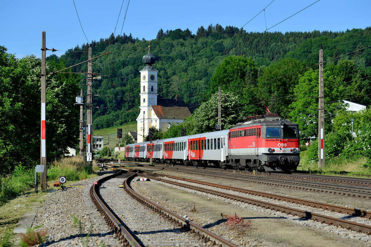 Das Motiv einmal aus der "Froschperspektive": Die gut gepflegte 1144.223 läuft mit ihrem REX 1785 nach Linz HBF in den Bahnhof Wernstein ein. Im Hintergrund die Pfarrkirche zum hl. Georg (12. Juni 2015).