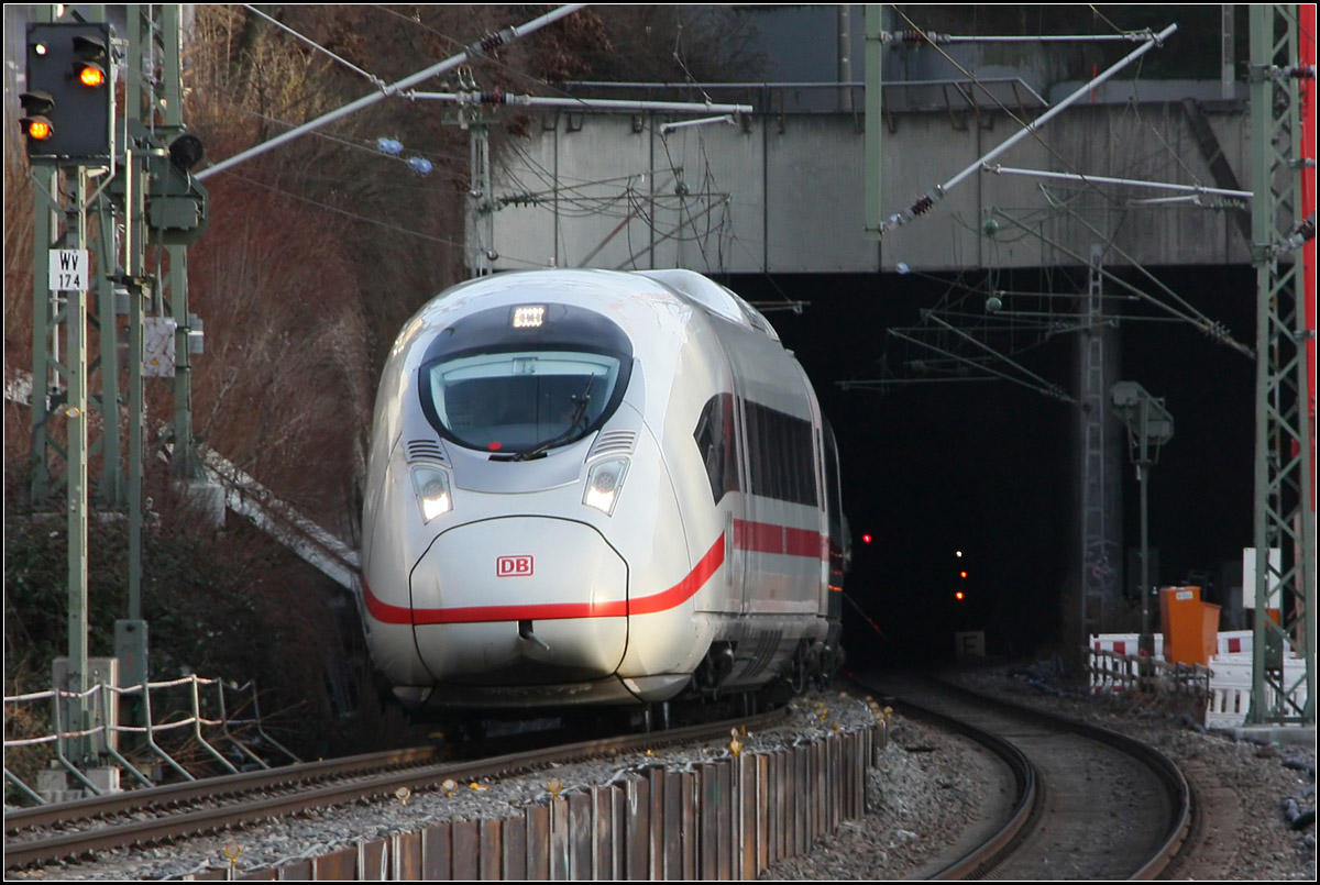 ... der Rest des Zug ist verdeckt, bzw. im Tunnel. Ein Velaro D bei der Ausfahrt aus dem Pragtunnel beim Bahnhof Stuttgart-Feuerbach.