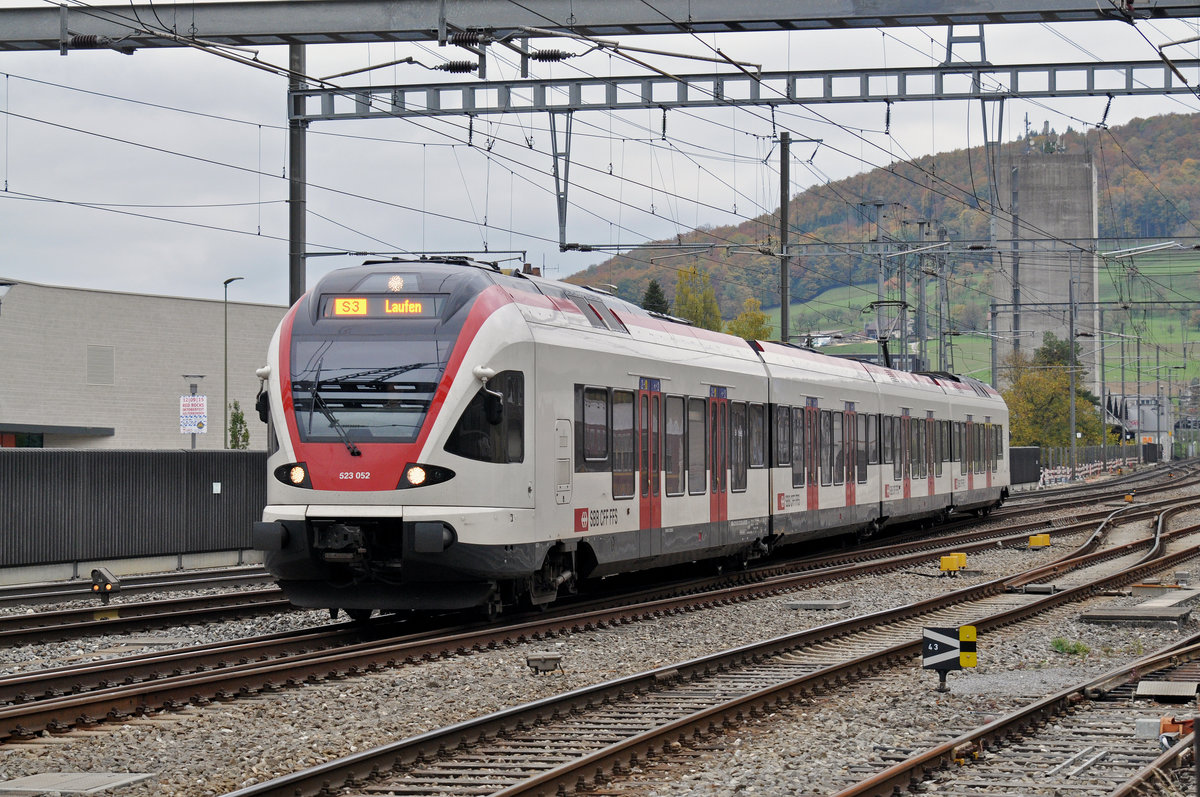 RABe 523 052, auf der S3, fährt beim Bahnhof Sissach ein. Die Aufnahme stammt vom 23.10.2015.