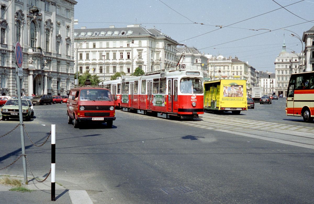 Wien Wiener Stadtwerke-Verkehrsbetriebe (WVB) SL 71 (E2 4023 (SGP 1979) + c5 1423 (Bombardier-Rotax 1978)) III, Landstraße, Schwarzenbergplatz im August 1994. - Scan von einem Farbnegativ. Film: Kodak Gold 200. Kamera: Minolta XG-1.