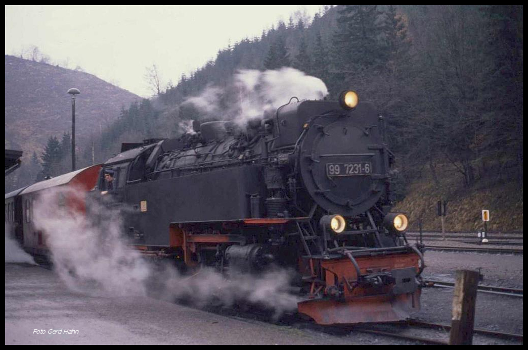 997231 hält auf dem Weg nach Nordhausen am 6.3.1990 im Bahnhof Eisfelder Talmühle.