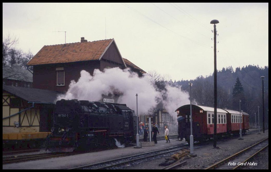 997242 fährt mit einem Personenzug aus Harzgerode am 6.3.1990 in den Bahnhof Alexisbad ein.