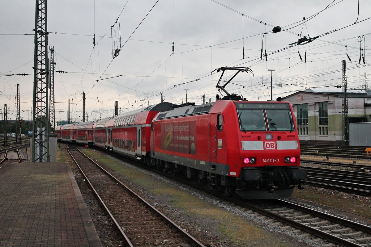 Nachschuss am 23.07.2015 auf die Freiburger 146 111-0 "Baden Württemberg erfahren", als sie ihren RE (Basel Bad Bf - Offenburg) aus dem Badischen Bahnhof von Basel gen Weil am Rhein schiebte.
