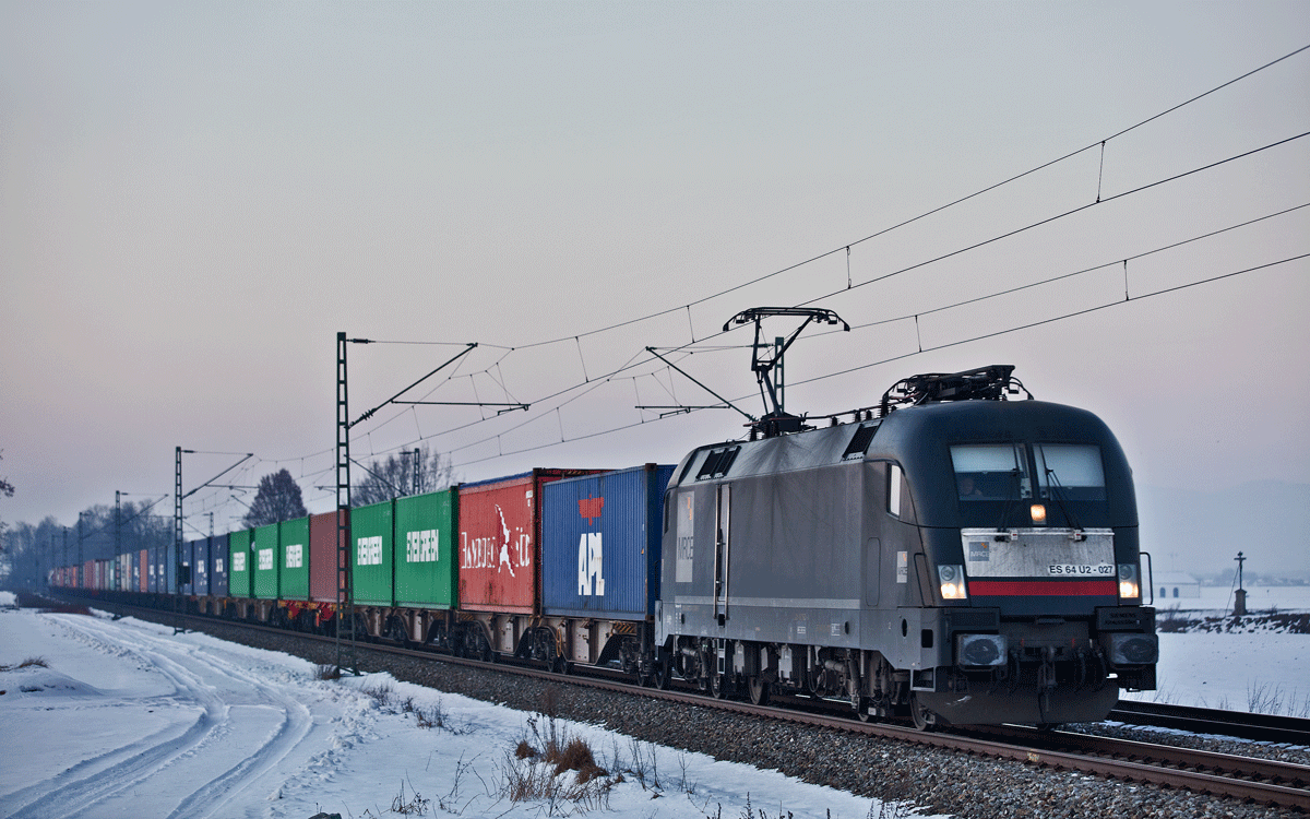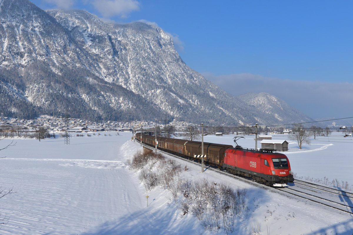 1016 027 mit einem Güterzug am 18.01.2017 bei Kirchbichl.