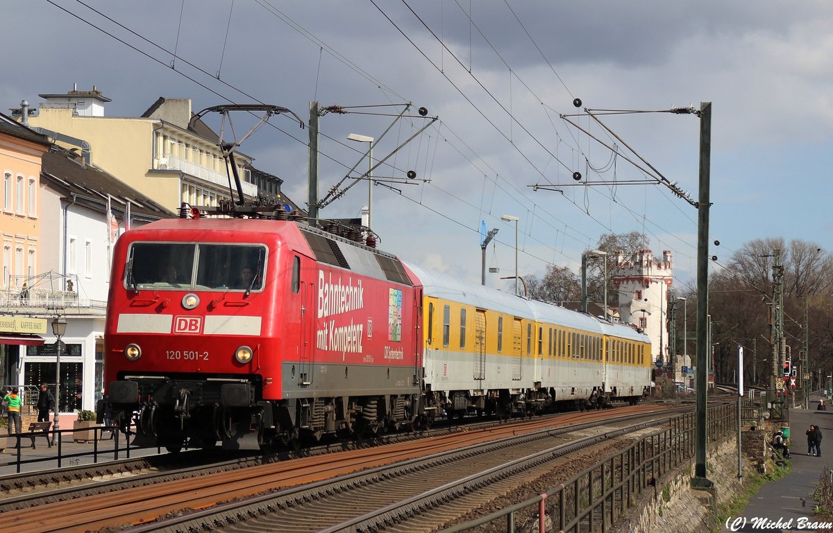 120 501 mit einem Messzug vor der Ortskulisse von Rüdesheim auf der rechten Rheinstrecke, aufgenommen am 29.03.16.