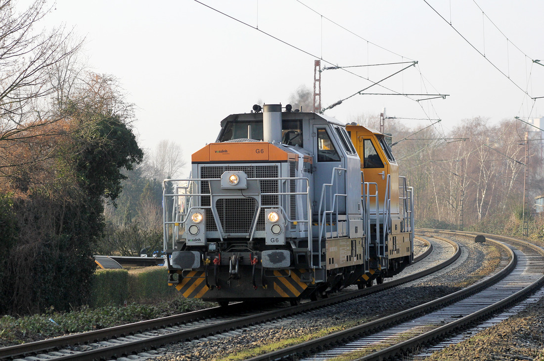 Am 17. Januar 2017 konnte ich Gelsenkirchen, genauer gesagt am BÜ Uechtingstraße, diese interessante Fuhre dokumentieren. Ziel der Fahrt war wahrscheinlich Gelsenkirchen-Horst Nord. 650 109 schleppt 650 129, die noch das Farbschema des Vorbesitzers BASF trägt.