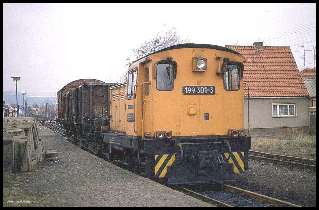 Am 6.3.1990 gab es noch Güterverkehr mit Rollböcken bei der Harzer Schmalspurbahn. Am 6.3.1990 kam mir bei Niedersachswerfen 199301 mit einem Güterzug in Richtung Nordhausen fahrend entgegen.