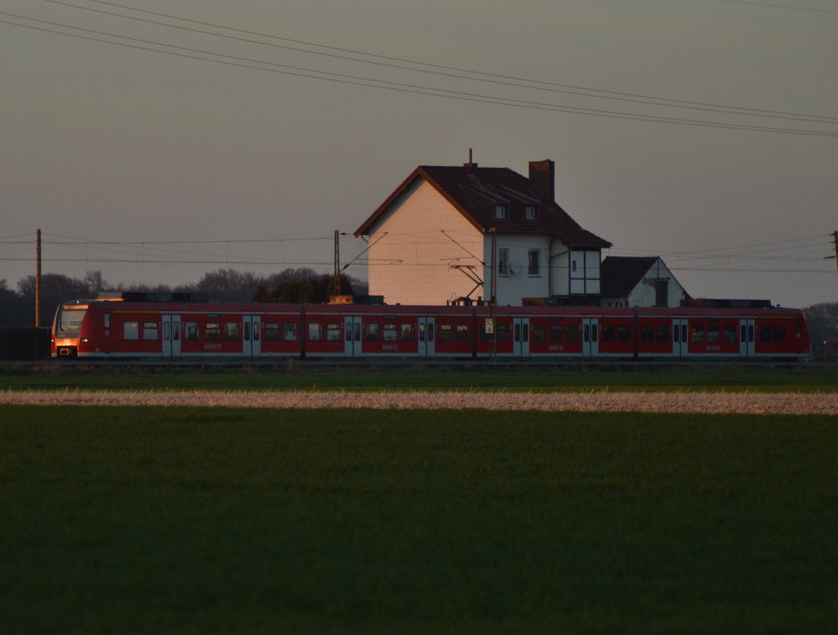 Am Abend des 22.3.2015 fährt ein unbekannter 425 als RB33 nach Duisburg. Der Zug ist hier auf höhe der Ortschaft Beckrath, die zu Mönchengladbach gehört.
