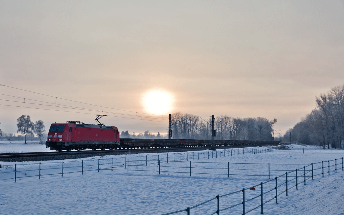 Die 185 348-0 fährt am frühen Morgen mit einem Stahlplattenzug in Langenisarhofen vorüber.Bild vom 19.1.2017