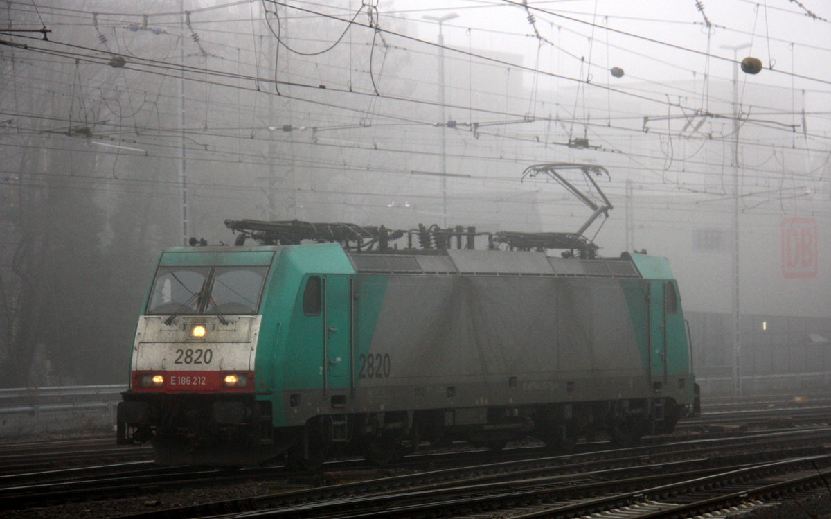 Die Cobra 2820 rangiert in Aachen-West. Aufgenommen vom Bahnsteig in Aachen-West. Bei Nebel am Kalten Mittag vom 8.1.2017.