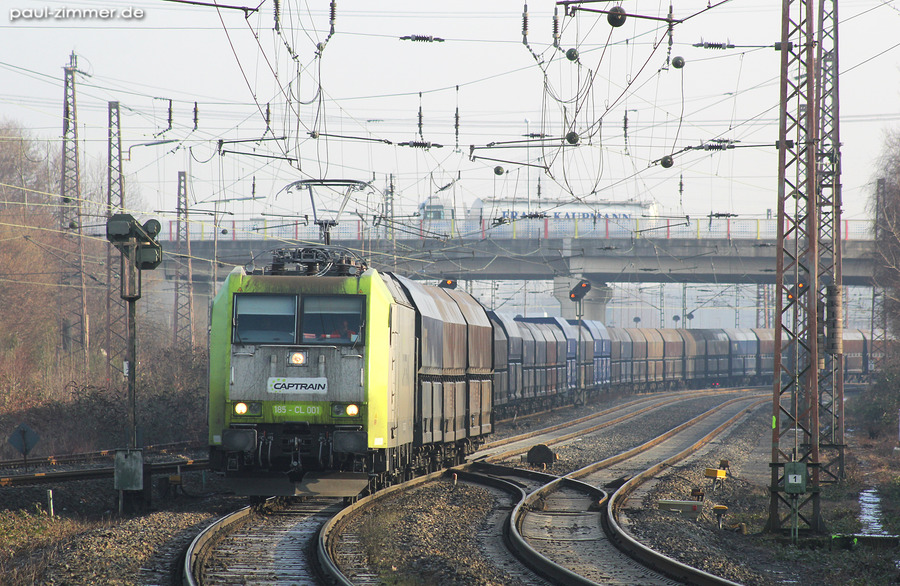 Die etwas unsaubere 185-CL 001 von Captrain passiert auf dem Weg von Bremen Stahlwerke nach Bottrop Süd den Güterbahnhof Gelsenkirchen-Bismarck am 17. Januar 2017.