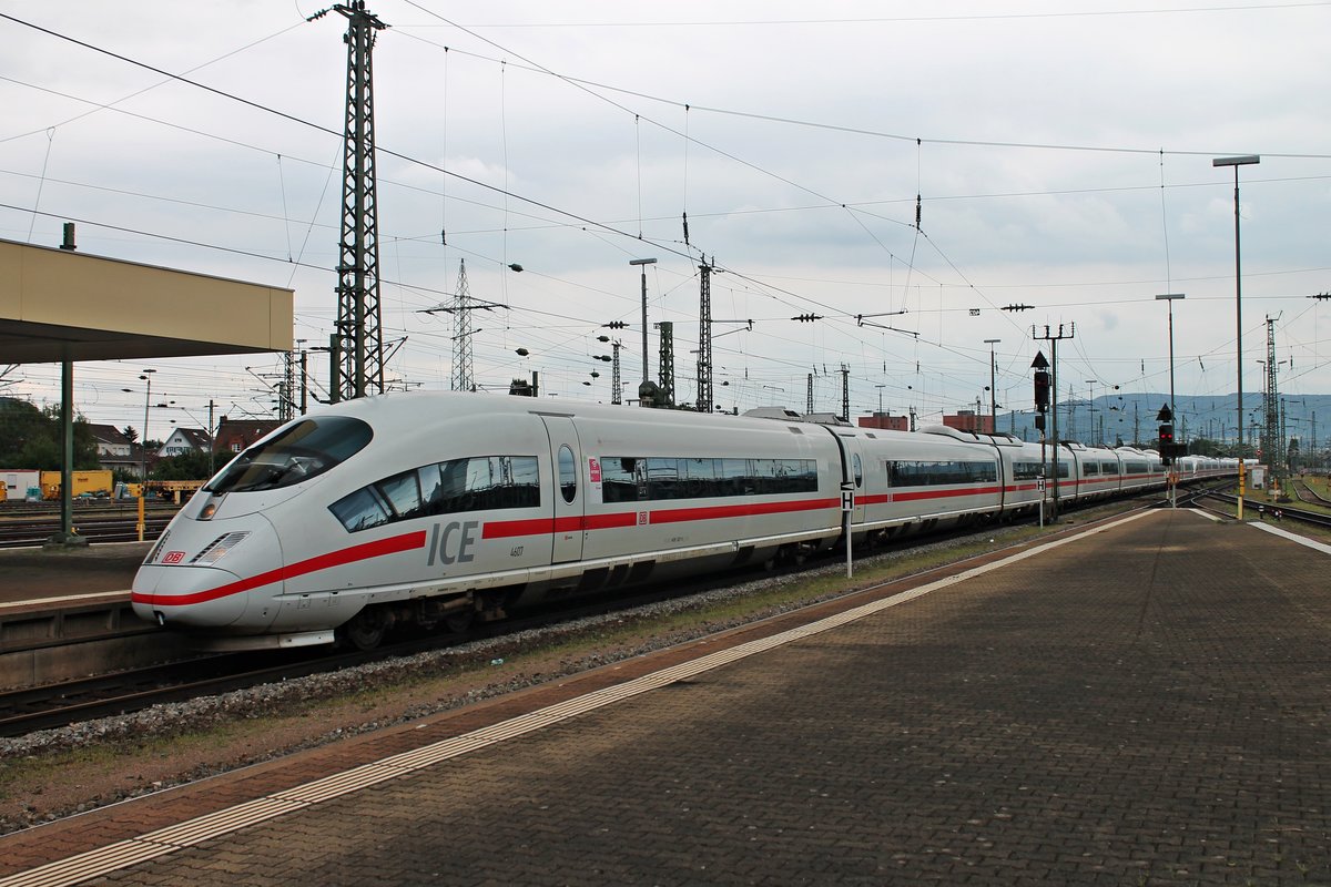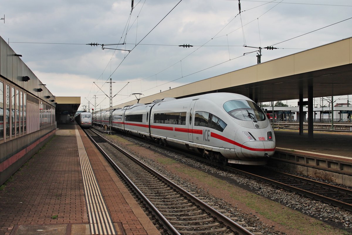 Nachschuss am 23.07.2015 auf 406 503-3 (4603) "Mannheim", als dieser als ICE 104 (Basel SBB - Amsterdam CS) zusammen mit 406 007-5 (4607) "Hannover" als ICE 504 (Basel SBB - Köln Hbf) in Basel Bad Bf auf Gleis 4 am Bahnsteig standen.