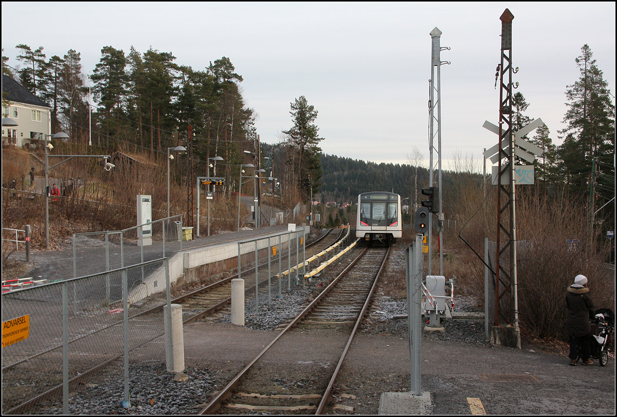 Sehr einfacher Standard - Die Haltestellen der Osloer U-Bahnstrecke zum Holmenkollen entsprechen nicht dem, was man sonst von einer U-Bahnstation erwartet. Auch können die Gleise trotz Stromschiene durch Autos oder Fußgänger gequert werden. Haltestelle 'Besserud'. 30.12.2013 (M)