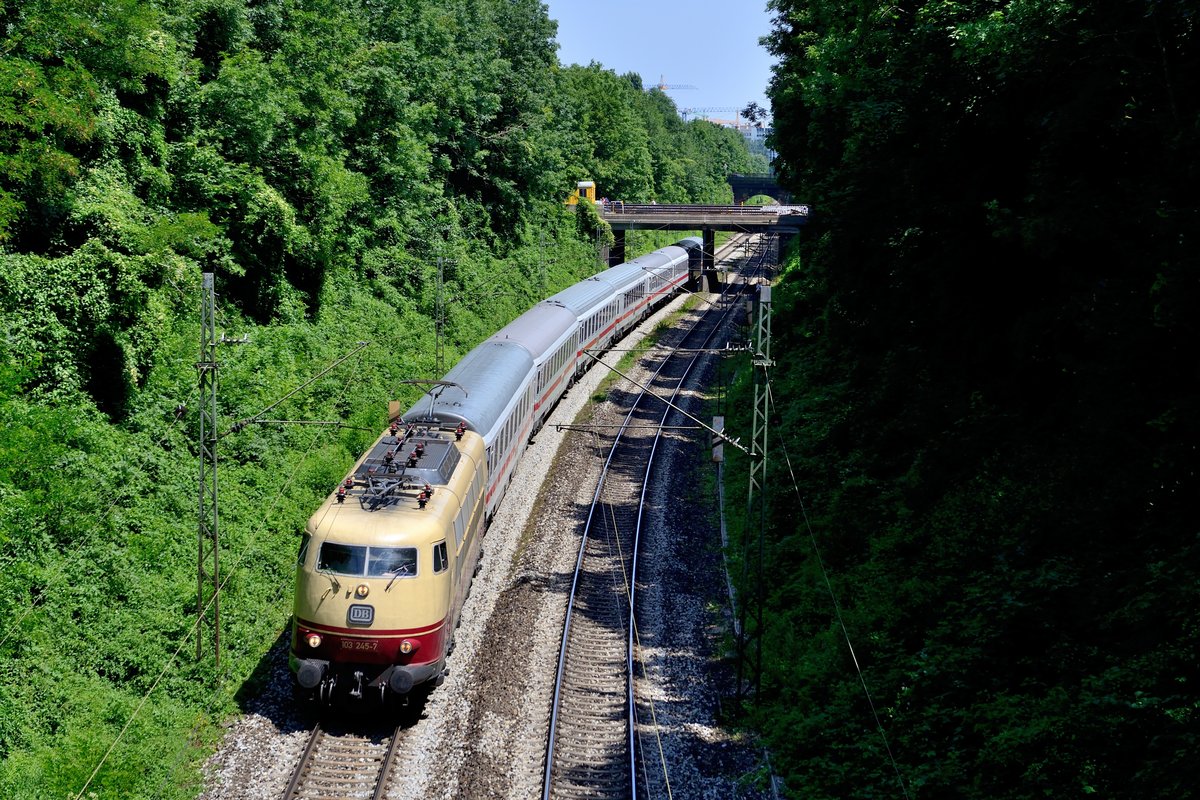 Zur Urlaubssaison im Sommer verkehrt IC 1284 von Schwarzach-St. Veit nach Flensburg. Dieser nur Sonntags eingesetzte Zug wird zwischen Wörgl und München HBF regelmäßig von der 103 245 befördert. Am 05. Juli 2015 konnte die pünktlich auf die Minute verkehrende Leistung im Einschnitt am Münchner Nockherberg aufgenommen werden.