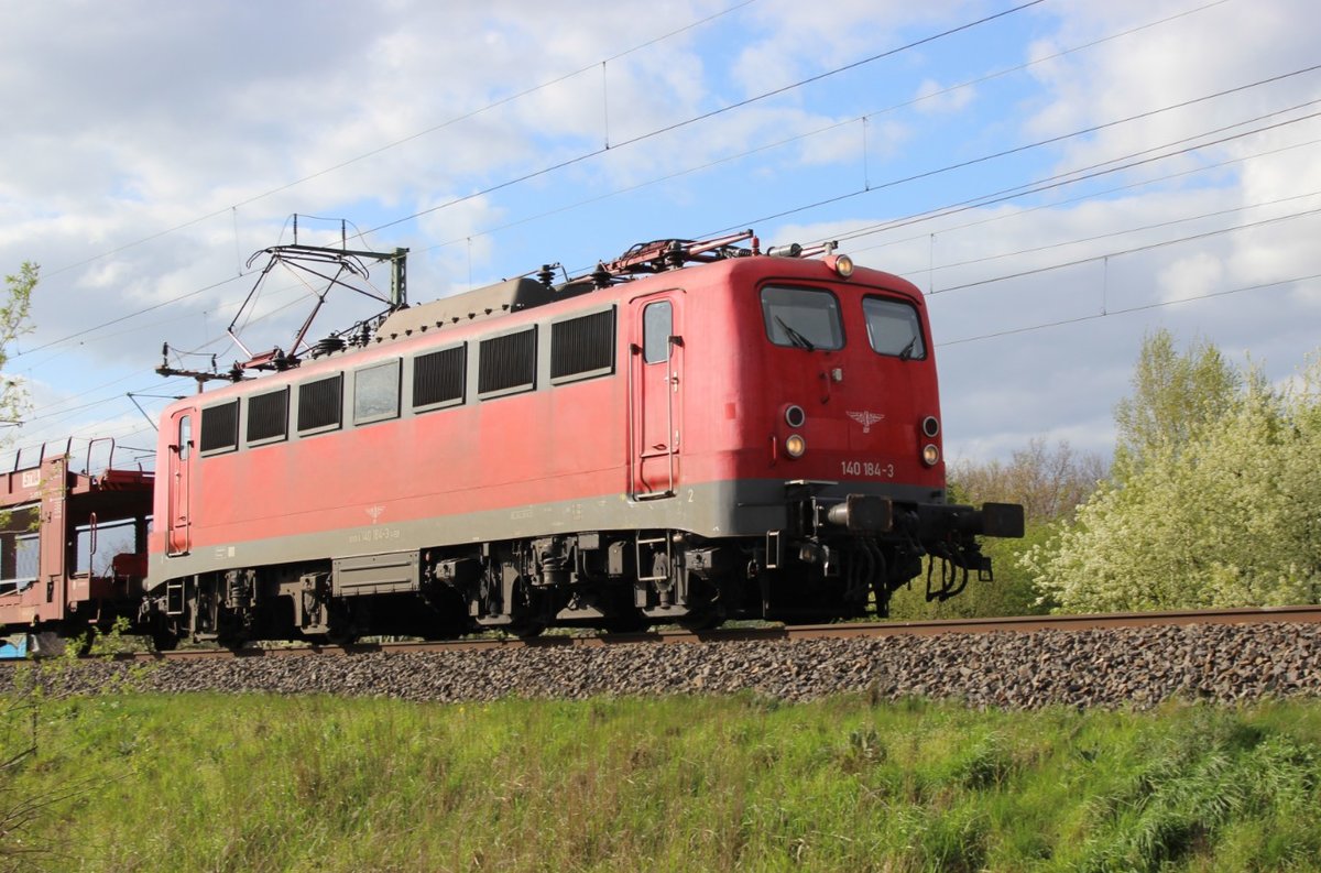 140 184-3 zieht am 19.04.2016 einen leeren Autozug, kurz nachdem Dedensen-Gümmer passiert wurde.