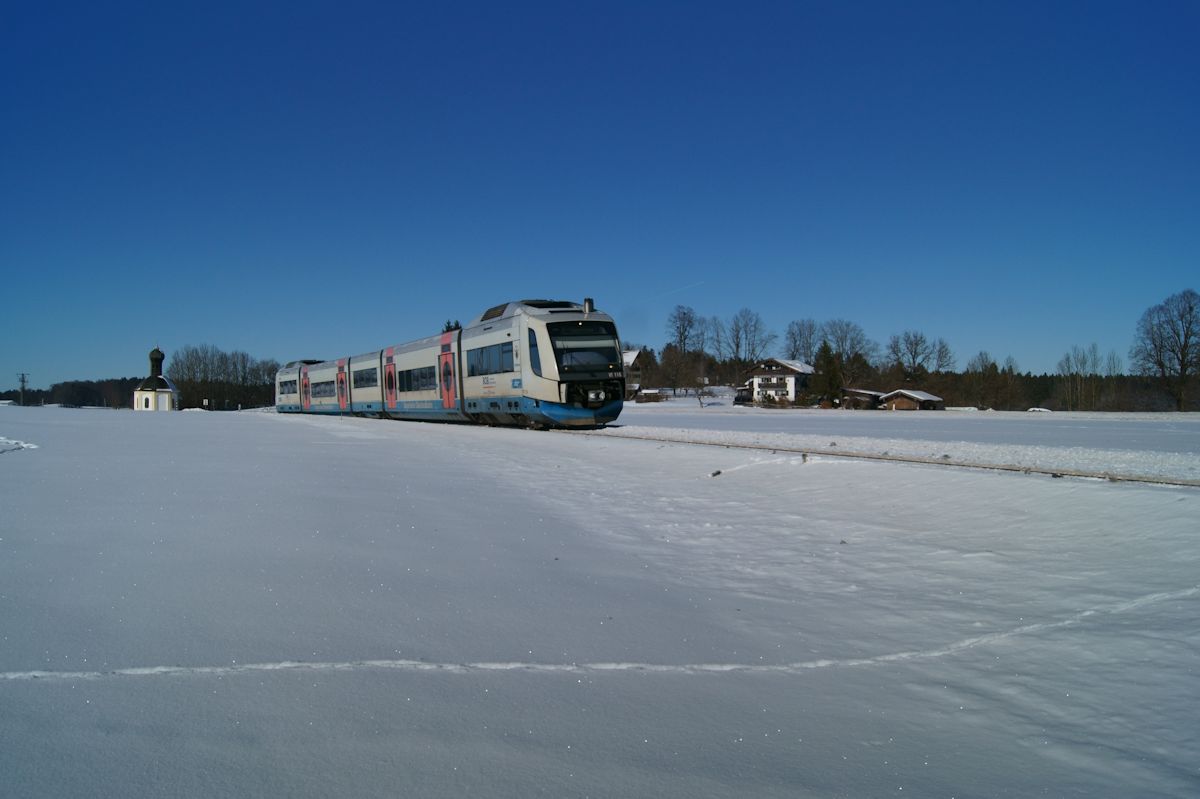 Auf dem Weg von München nach Tegernsee hat VT116 der Bayerischen Oberlandbahn als BOB 86917 Schaftlach verlassen und passiert hier das barocke Freikircherl, welches um 1800 entstanden ist.