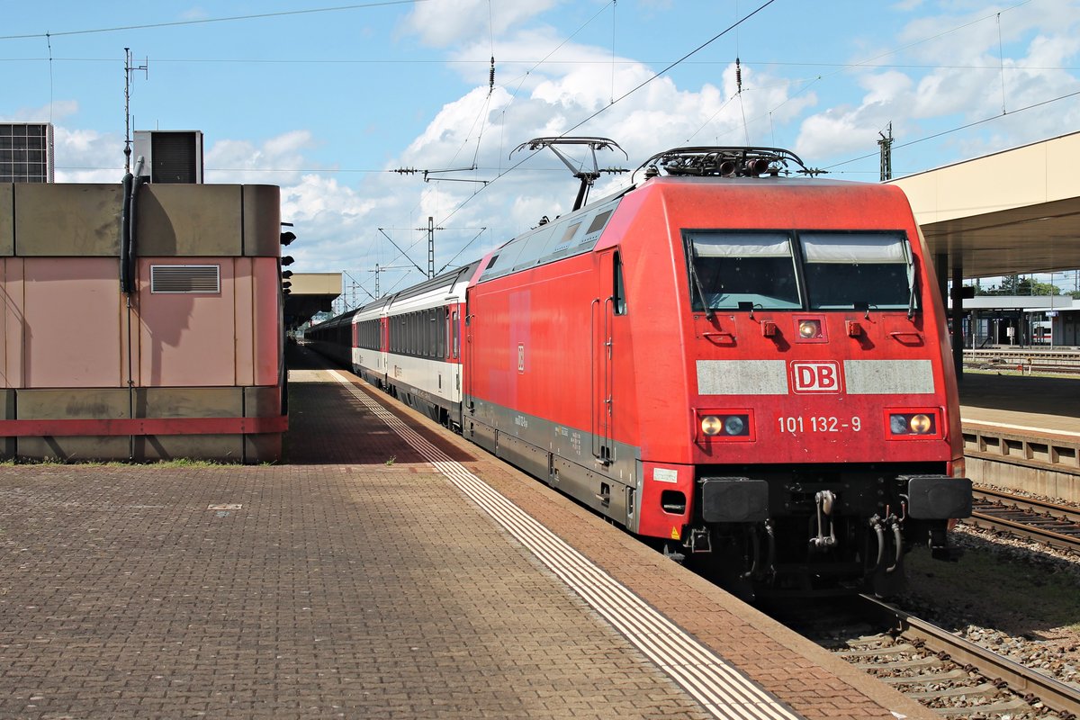 Ausfahrt am 27.07.2015 von 101 132-9 mit dem EC 9 (Hamburg Altona - Zürich HB) aus dem Badischen Bahnhof von Basel in Richtung Basel SBB.