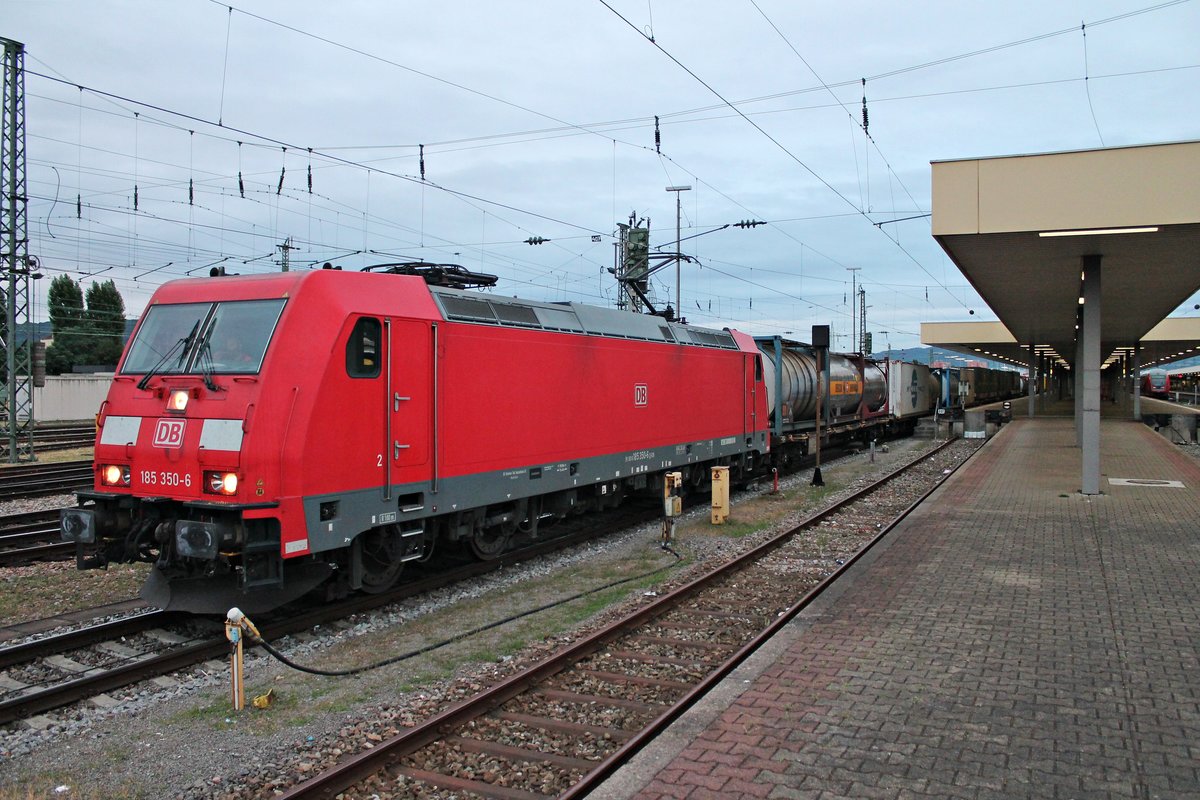 Ausfahrt am Morgen des 29.07.2015 von der Mannheimer 185 350-6 mit einem Containerzug aus dem Badischen Bahnhof von Basel in Richtung Weil am Rhein.