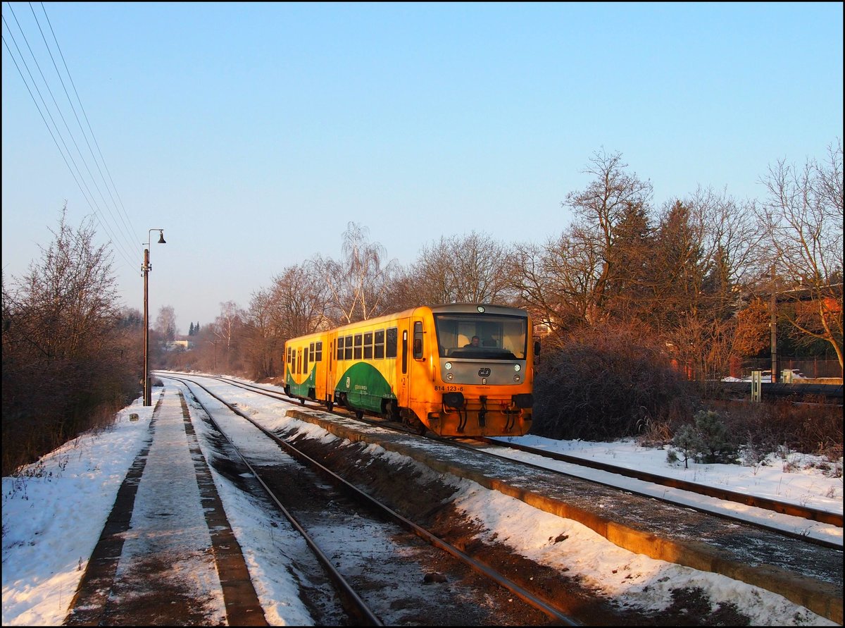 CD 814 123-6 kommt nach Bahnhof Kladno Ostrovec am 23.1. 2017.