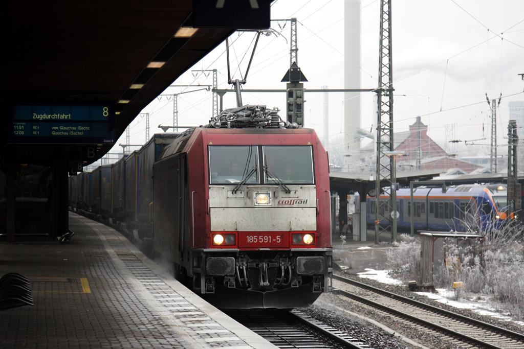 Crossrail 185591-5 kam am 23.01.2017 um 10.38 Uhr auf Gleis 8 mit dem LKW - Walter durch den HBF Göttingen in Fahrtrichtung Süden.