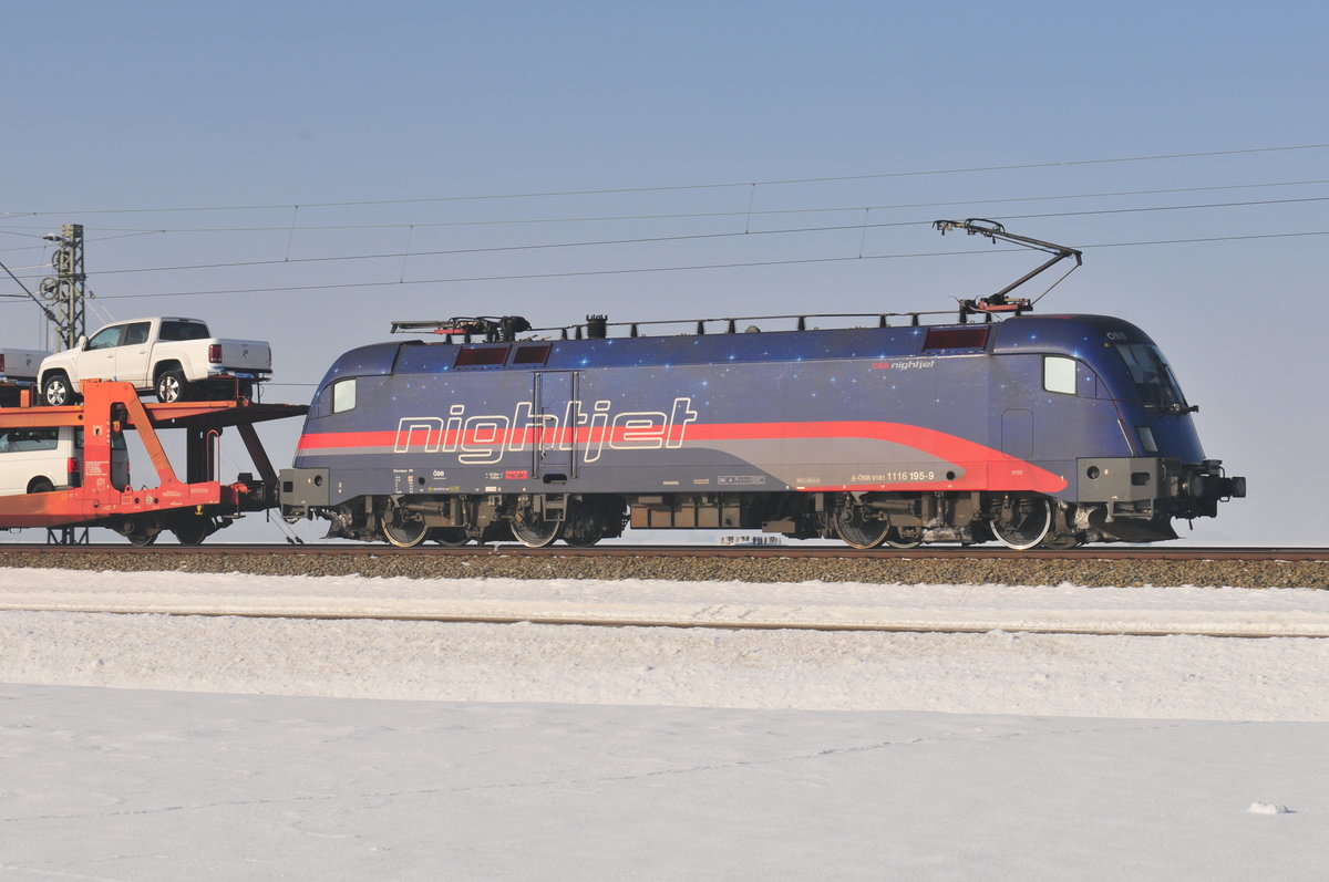 Die 1116 195-9 "Nightjet Lok" der ÖBB vor einem Autozug mit Neuwagen in Richtung Salzburg am 23.01.17 bei Übersee am Chiemsee.