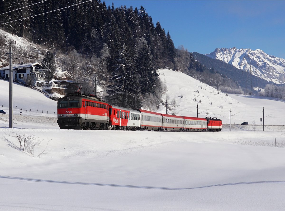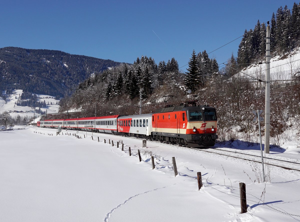 Die 1144 117 mit einem OIC nach Graz am 21.01.2017 unterwegs bei Altenmarkt im Pongau.